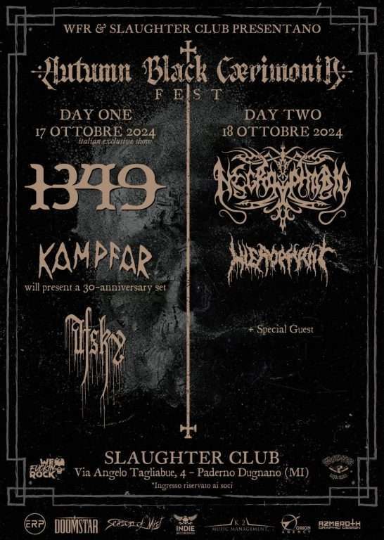 1349: “Poco sapevamo, più di quattro anni fa, che quando saremmo andati di nuovo in tournée in Europa, il continente sarebbe stato colpito da una pandemia e da una guerra. Siamo entrati in un’epoca in cui le tristi realtà si sono già manifestate, e un’oscurità ancora più profonda incombe su di noi e ha iniziato la sua discesa. Per riprendere i titoli delle nostre canzoni, le campane di guerra di Pandemonium risuonano in lontananza, minacciando di diventare più forti. È diventato imminente comprendere e assorbire la gravità e lasciare che l’oscurità affondi, e 1349 potrebbe essere la colonna sonora perfetta. Soprattutto ora che stiamo per pubblicare un album particolarmente sinistro e inquietante. Non vediamo l’ora di recarci di nuovo nel continente per sentire dal vivo come funzionano le nuove canzoni in tutto il loro splendore demoniaco, oltre a eseguire brani della nostra storia e condividere le loro energie con i vecchi fan e con i nuovi. Siamo anche felici di condividere il palco con i compagni Norsemen Kampfar e con i nostri fratelli danesi Afsky che si uniranno a noi nel nostro viaggio verso sud”.