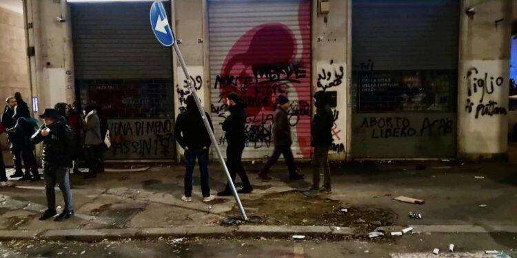 Momenti di tensione davanti alla sede di Pro Vita & Famiglia in viale Manzoni, durante il corteo di Non una di meno a Roma.
