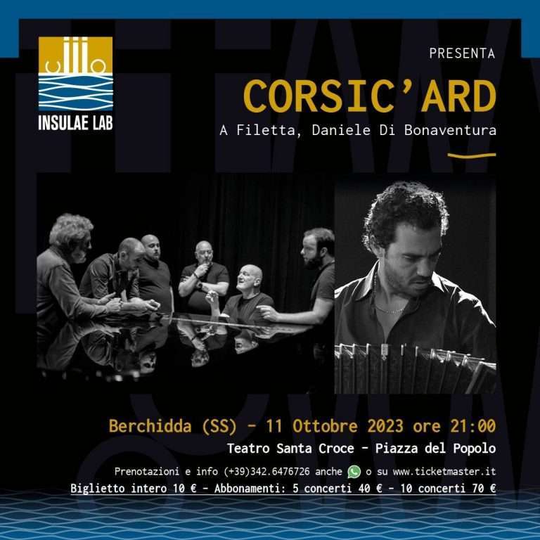 Sul palcoscenico sarà presentato CORSIC’ARD: fortunato crocevia fra la polifonia contemporanea corsa e il repertorio mediterraneo, impreziosito dalla performance di un improvvisatore puro come il marchigiano Daniele Bonaventura con il suo bandoneon; il progetto è co-arrangiato da Jean-Claude Acquaviva, leader storico del gruppo vocale A Filetta (felce, in lingua corsa) e dallo stesso Di Bonaventura. Una miscela che ha sfumature cangianti e accattivanti, che coinvolge e avvolge in un susseguirsi di suggestioni che richiamano e riportano alla terra, quella corsa e quella di Sardegna.