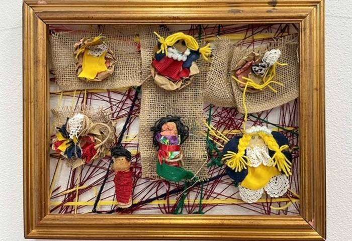 Quadri e creazioni realizzati con materiali riciclati, vecchie cornici, iuta, spago, stoffe, bottoni, mollette, rame, legno.