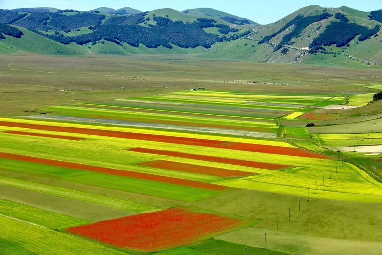 Il Pian grande è una tavolozza di colori dove a dominare è il rosso dei papaveri e il giallo della senape selvatica, ma si stanno affacciando anche il bianco delle margherite, il blu dei fiordalisi e il celestino della lenticchia.