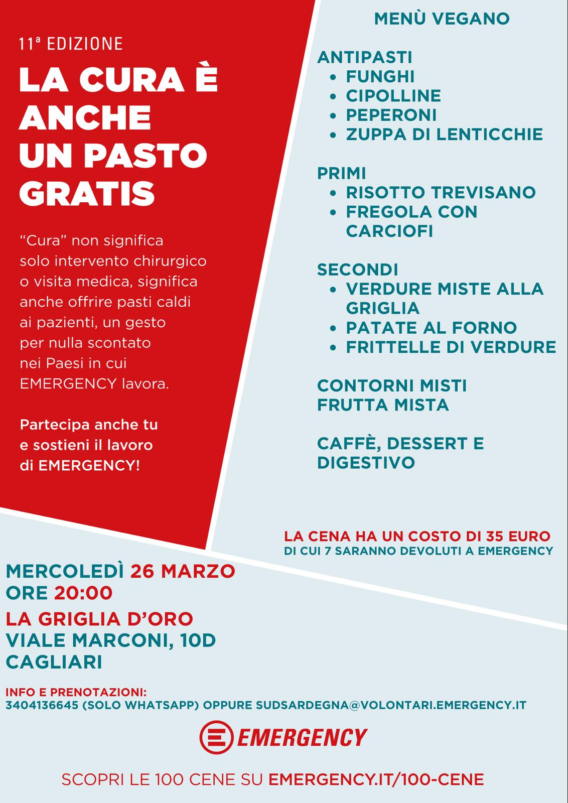A Cagliari il 26 marzo 2025 alle h 20.00, presso il ristorante La Griglia d’Oro in Viale Marconi 10D, si svolgerà la prima delle 100 Cene per Emergency.