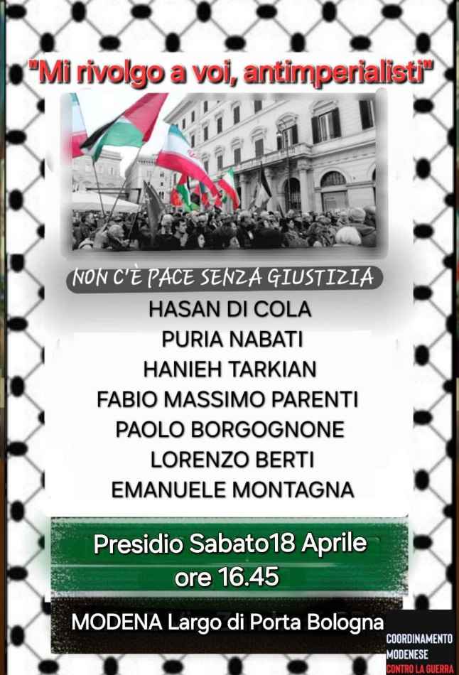 Un presidio importante, in cui la voce degli anti imperialisti si farà sentire”, afferma il Coordinamento Modenese contro la Guerra imperialista che annuncia una manifestazione per sabato 18 aprile alle ore 16:45, Largo Porta Bologna.