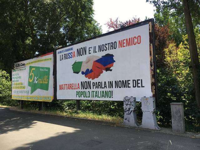 Uno dei tre manifesti vuole sottolineare nuovamente il dissenso verso le frasi del Presidente Mattarella che qualche mese fa paragonò la Russia al Terzo Reich, una inaccettabile ed offensiva forzatura nei riguardi di una nazione che nella seconda guerra mondiale ha pagato un prezzo altissimo, con 26 milioni di morti ed un territorio terribilmente devastato.
