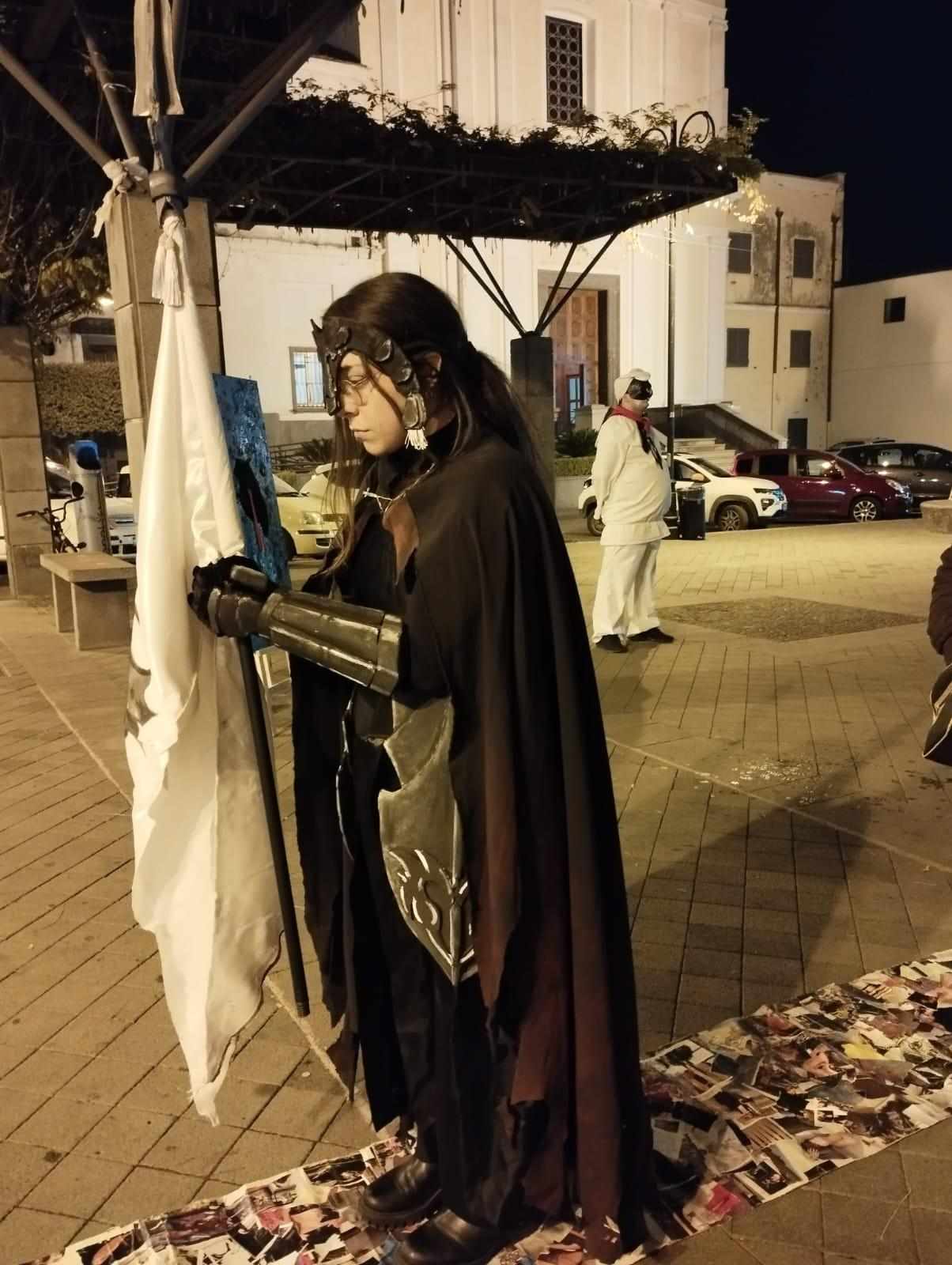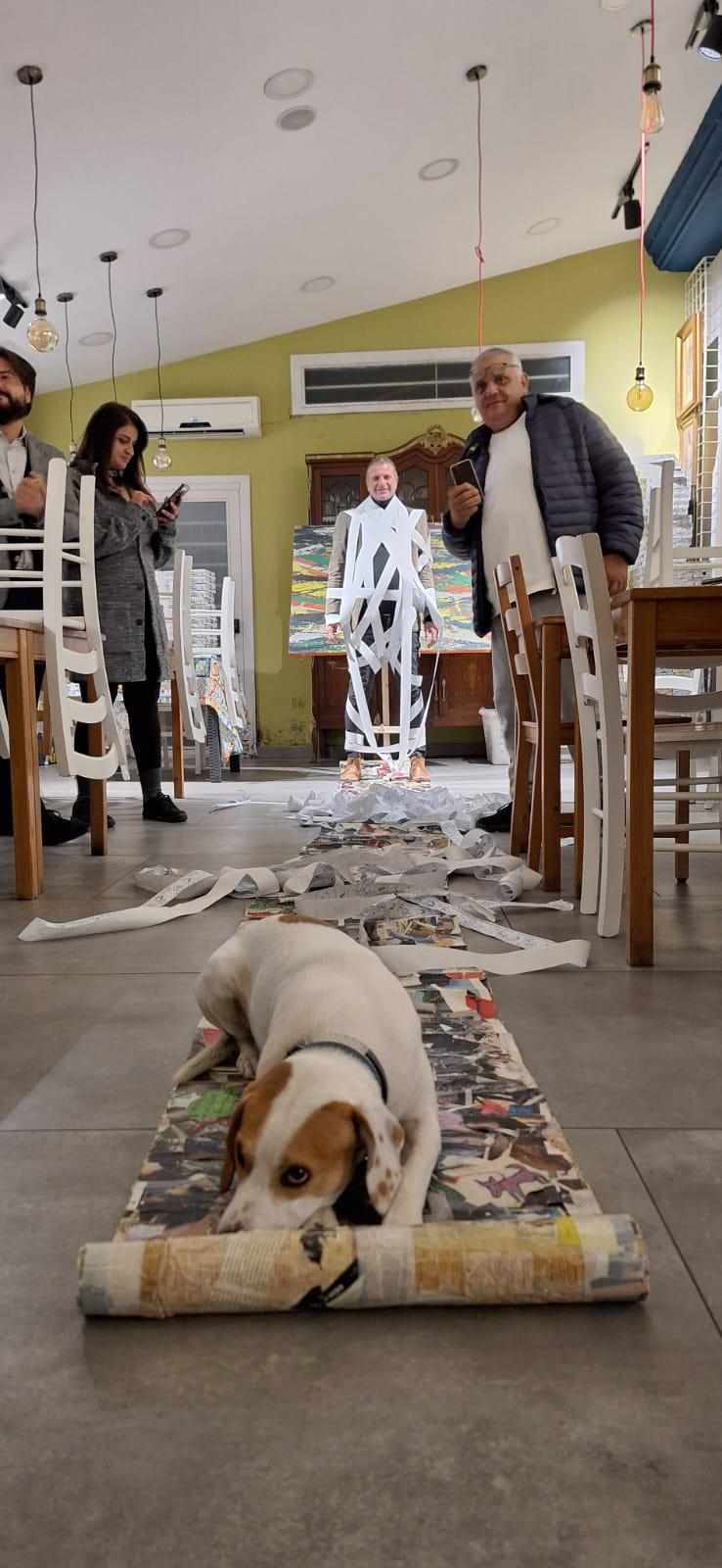 Nonostante fossi il curatore, ho realizzato dei lavori in Piazza insieme a Caterina Incani, artista che reputo essere un traino generazionale per la l’arte visiva che verrà, vent’anni, studentessa dell’Accademia di Belle Arti di Firenze (a Cagliari non c’è), ha affrontato la tematica partendo da ciò che affronta nel quotidiano con la Sindrome di Caroli e il rene policistico autosomico recessivo, simbolicamente quanto e come dipendono dalla dipendenza altrui? E se l’altro non sa amare ed accettare certi aspetti patologici legati all’esistenza quotidiana che vanno ben oltre ciò che è diagnosticato? Dei suoi lavori realizzati in Piazza, una è stato acquisito dal prelato Don Raffaele Rianna della Chiesa di San Gennarello. Tutto questo è stato possibile, perché da anni un collezionista come Michele Franzese investe sul valore dell’arte contemporanea coma valore aggiunto aggregativo comunitario sociale, facendo in modo che un’amministrazione comunale come quella del Sindaco Biagio Simonetti e l’Assessore alle pari opportunità Maddalena Massa la rendessero possibile. Si è aggiunto a tutto questo un fuori programma presso Sciusciante, nello spazio di Michele Franzese, dove Enzo Correnti ha bissato la sua performance, incartando l’artista Luigi Di Sarno nell’atto di dipingere i suoi lavori, liberando invece le donne costrette a comprenderne il contenuto per renderlo fruibile in termini di sensibilità ed elevazione coscienziale senza la quale l’artista è impossibilitato a liberarsi dal peso del Sé.