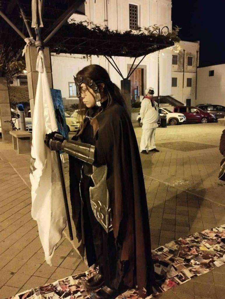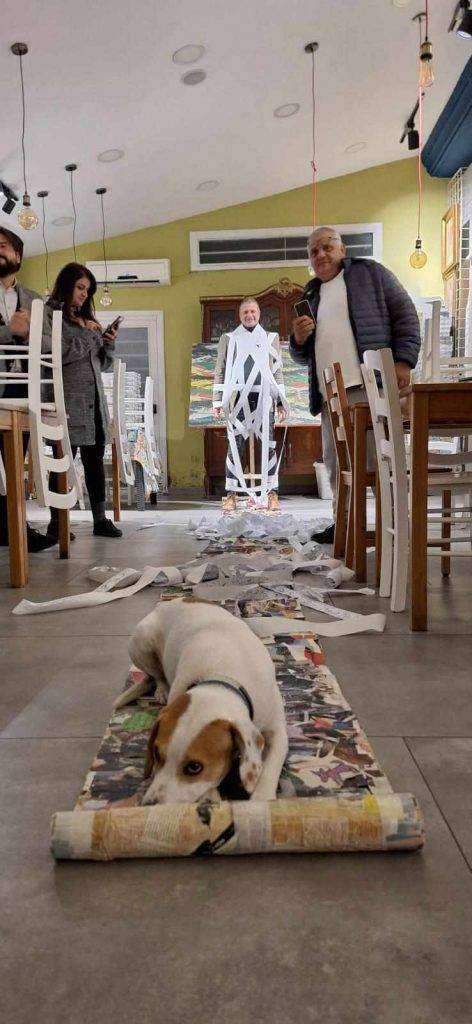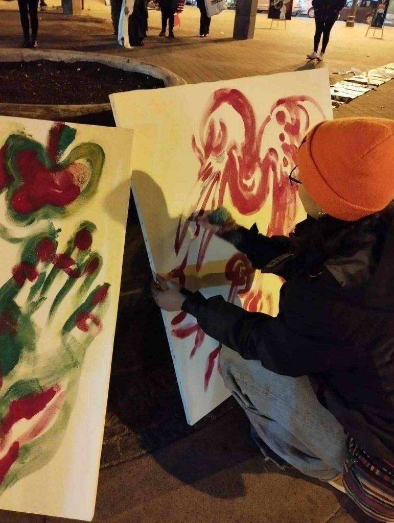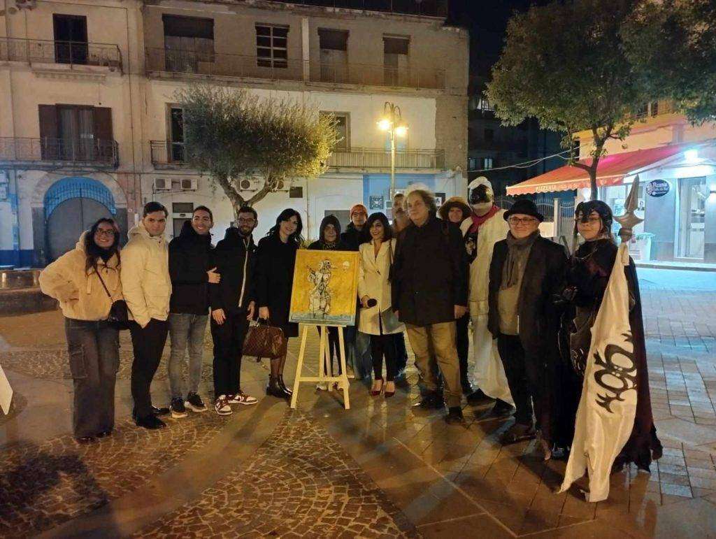 Nonostante fossi il curatore, ho realizzato dei lavori in Piazza insieme a Caterina Incani, artista che reputo essere un traino generazionale per la l’arte visiva che verrà, vent’anni, studentessa dell’Accademia di Belle Arti di Firenze (a Cagliari non c’è), ha affrontato la tematica partendo da ciò che affronta nel quotidiano con la Sindrome di Caroli e il rene policistico autosomico recessivo, simbolicamente quanto e come dipendono dalla dipendenza altrui? E se l’altro non sa amare ed accettare certi aspetti patologici legati all’esistenza quotidiana che vanno ben oltre ciò che è diagnosticato? Dei suoi lavori realizzati in Piazza, una è stato acquisito dal prelato Don Raffaele Rianna della Chiesa di San Gennarello. Tutto questo è stato possibile, perché da anni un collezionista come Michele Franzese investe sul valore dell’arte contemporanea coma valore aggiunto aggregativo comunitario sociale, facendo in modo che un’amministrazione comunale come quella del Sindaco Biagio Simonetti e l’Assessore alle pari opportunità Maddalena Massa la rendessero possibile. Si è aggiunto a tutto questo un fuori programma presso Sciusciante, nello spazio di Michele Franzese, dove Enzo Correnti ha bissato la sua performance, incartando l’artista Luigi Di Sarno nell’atto di dipingere i suoi lavori, liberando invece le donne costrette a comprenderne il contenuto per renderlo fruibile in termini di sensibilità ed elevazione coscienziale senza la quale l’artista è impossibilitato a liberarsi dal peso del Sé.