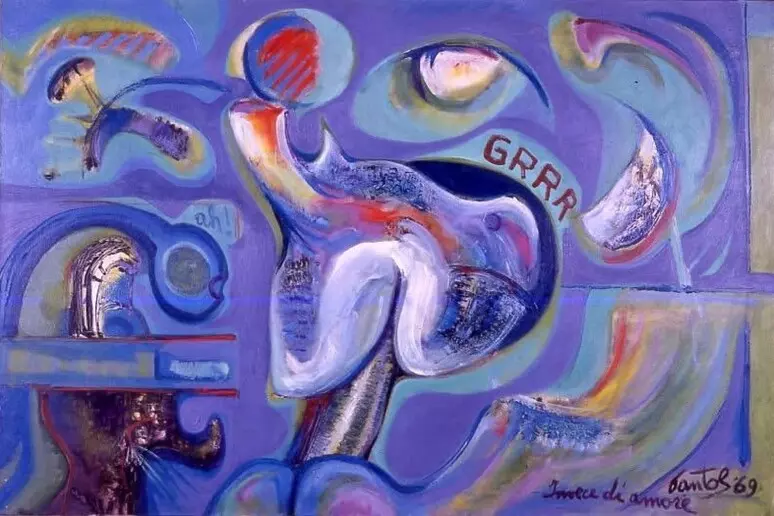 Dai toni meno cupi è Grrr invece di amore (1969), che ha ispirato il titolo della mostra. “É in questo frangente che la forma perde di consistenza fino a scomporsi e galleggiare nell’atmosfera. Mentre ai colori brillanti associa i primi interventi didascalici”, aggiunge la critica d’arte.