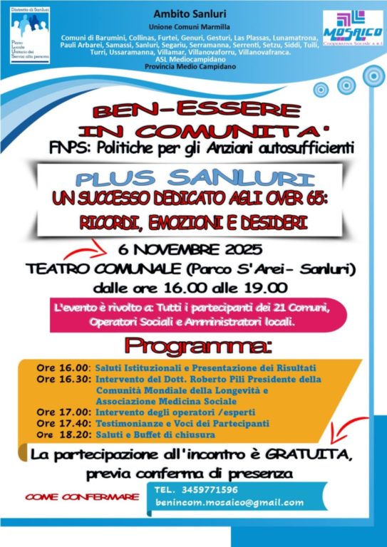La nostra comunità dimostra che il benessere non nasce solo dai servizi, ma soprattutto dalle relazioni umane, dall’ascolto e dal sentirsi parte di un progetto comune. Sanluri vuole continuare su questa strada, investendo in una cittadinanza attiva, solidale e capace di prendersi cura di sé e degli altri.” Il progetto Ben-Essere in Comunità proseguirà nei prossimi mesi con nuove attività rivolte ai cittadini di tutte le età, per consolidare un modello di comunità più coesa, partecipata e sana.