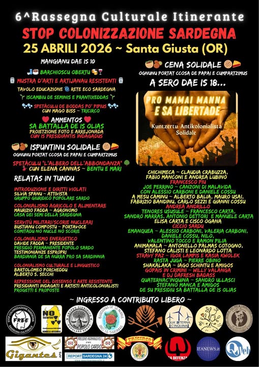 La Rassegna era nata nel Maggio 2024, in cc concomitanza con l’inizio dell’invasione eolica al Porto di Oristano, con l’obiettivo di creare consapevolezza sulla gravità della situazione in Sardegna. Silvia Spanu, portavoce della Rassegna e del Gruppo Giuridico Popolare Sardo, sottolinea come sia “importante chiarire che non si tratta di una mera speculazione, ma di colonizzazione, di sfruttamento e di oppressione, atti coloniali che sono crimini internazionali e violazioni dei diritti umani, dei popoli e dell’ambiente. La straordinaria presenza di molti artisti e musicisti sardi che suoneranno per la causa “Stop Colonizzazione Sardegna” al Concerto anticolonialista solidale ” Pro Mamai Manna e Sa Libertade” conferma l’intento della Rassegna di proseguire con una rivoluzione culturale e di unire le forze e di alzare la voce a difesa della nostra sacra terra e come forma di denuncia dello stato di occupazione e colonialismo interno eterodiretto che stiamo subendo da troppo tempo.