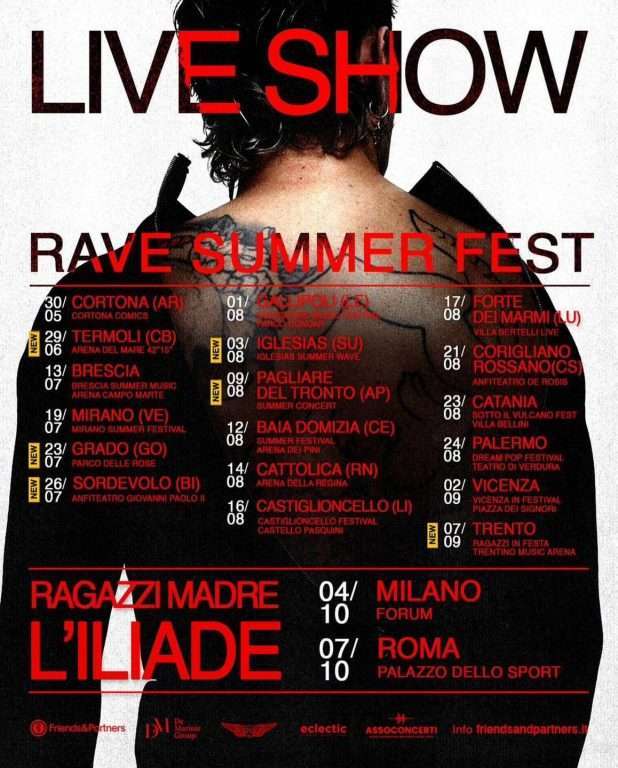Reduce dal successo di Ragazzi Madre – L’Iliade il docufilm che racconta il suo percorso artistico e i primi dieci anni di carriera ora Achille Lauro si getta nei concerti estivi. Il tour viene definito come un vero e proprio rave all’insegna dell’inclusività aperto a tuttǝ, artisti, ravers, freaks, famiglie e bambini che toccherà numerose location e festival italiani.