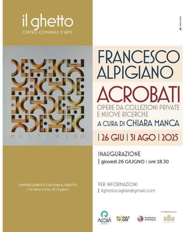 Dal 26 giugno al 31 agosto 2025, il Centro Comunale d’Arte e Cultura Il Ghetto di Cagliari ospita “Acrobati”, mostra personale dell’artista nuorese Francesco Alpigiano, a cura di Chiara Manca, organizzata da Agorà Sardegna e Coopculture, in collaborazione con il Comune di Cagliari e con il contributo della Fondazione di Sardegna.