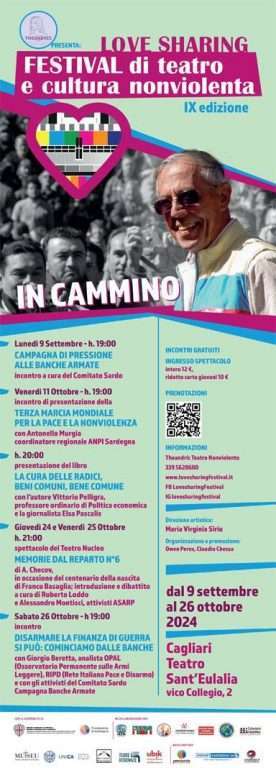 IL PROGRAMMA – La nona edizione di Love Sharing avrà inizio, dunque, domani (lunedì 9 settembre) alle ore 19 al Teatro Sant’Eulalia di Cagliari con l’incontro a cura del Comitato Sardo “Campagna di pressione alle banche armate”, promossa nel 2000 dalle riviste Missione Oggi, Mosaico di pace e Nigrizia, per favorire il controllo attivo dei cittadini sulle operazioni di finanziamento all’industria militare e al commercio di armi. L’obiettivo principale della campagna è la richiesta agli istituti di credito e alle banche di non finanziare la produzione e la commercializzazione di armamenti e di armi comuni, o quantomeno di definire direttive rigorose e pubbliche per autoregolamentare la propria attività nel settore. Il Movimento Nonviolento sta portando avanti a livello nazionale la Campagna di obiezione alla guerra; all’interno di questa campagna si colloca la Campagna di pressione alle banche armate che il Centro territoriale sardo del Movimento Nonviolento ha preparato e che adesso, insieme all’Unione Sindacale di Base-Confederazione Regionale Sardegna, sta promuovendo e coordinando.