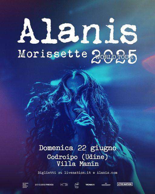 Il 22 giugno 2025 Alanis Morissette sarà in concerto a Villa Manin di Codroipo, Udine, per l’appuntamento inserito nel cartellone di “GO!2025&Friends”, il ricco palinsesto di eventi che affiancherà il programma ufficiale di “GO!2025”.