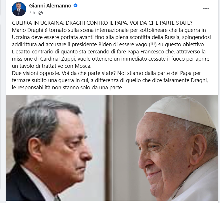 “Mario Draghi è tornato sulla scena internazionale per sottolineare che la guerra in Ucraina deve essere portata avanti fino alla piena sconfitta della Russia, spingendosi addirittura ad accusare il presidente Biden di essere vago (!!!) su questo obiettivo”, inizia così il post pubblicato da Gianni Alemanno, promotore del Comitato “Fermare la Guerra”.