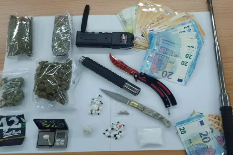 Ventisei dosi di cocaina, due dosi di Mdma, dieci grammi di Ketamina, cinquanta infiorescenze di marijuana dal peso complessivo di cento grammi, circa sessanta grammi di marijuana già tritata, un taser dissuasore elettrico, un coltello a farfalla con lama dalla lunghezza di 9 cm, un bastone telescopico, un bilancino elettronico di precisione e 2550 euro in banconote di diverso taglio, probabile provento di spaccio di sostanze stupefacenti: è quanto i Carabinieri della compagnia di Alghero, insieme con i militari della compagnia di intervento operativa del 6 Battaglione Toscana hanno sequestrato ad un ragazzo algherese di 20 anni, arrestato poi per detenzione di sostanze stupefacenti fini di spaccio.