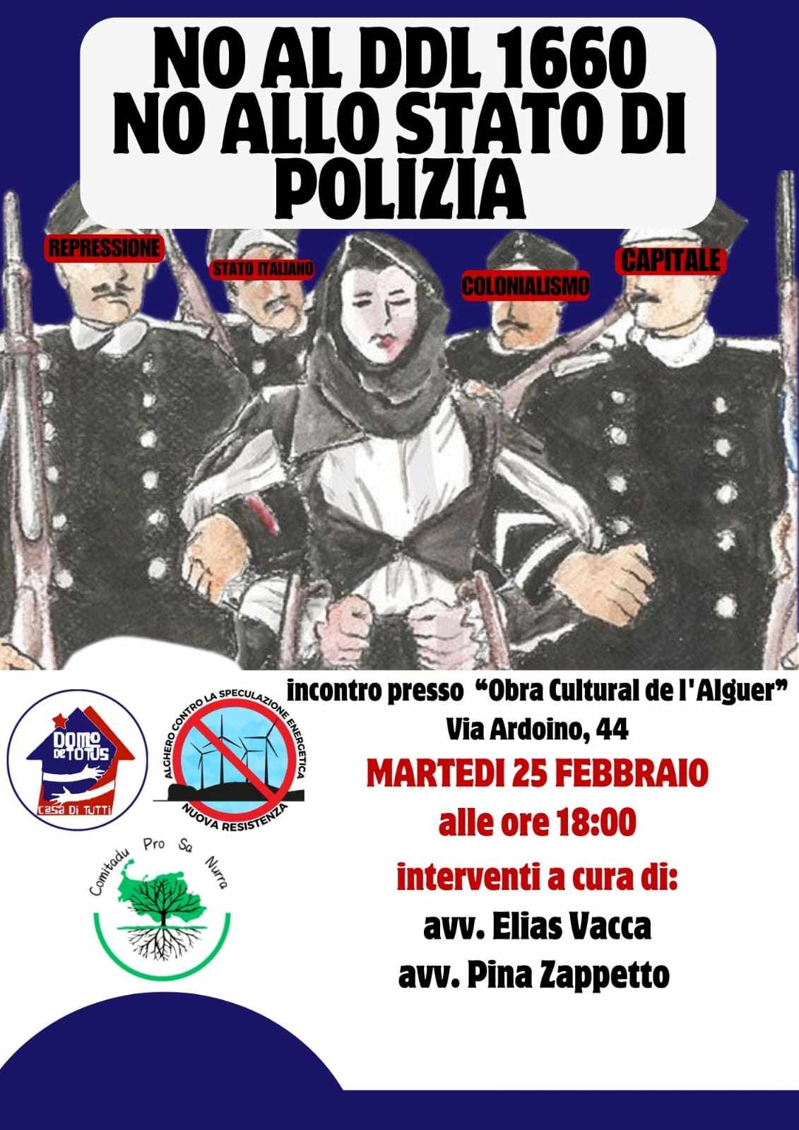 L’appuntamento è ad Alghero, giovedì 25 febbraio alle ore 18:00 presso l’Obra Culturale de l’Alguer, in via Ardoino 44. Saranno presenti gli avvocati Elias Vacca e Pina Zappetto, esperti in diritto penale e diritti civili, che illustreranno come il DDL 1660 potrebbe trasformarsi in uno strumento di criminalizzazione delle lotte sociali e ambientali.