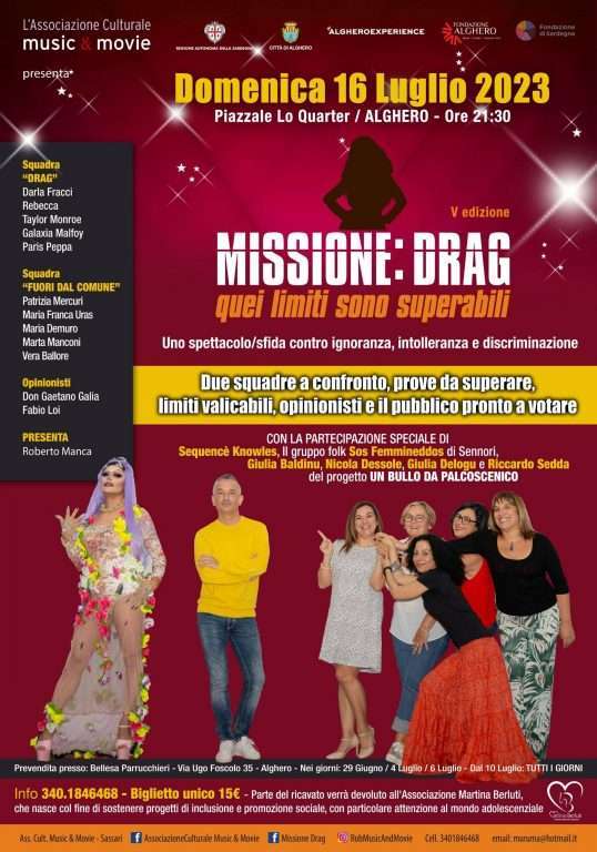 Per la sua quinta edizione, “Missione Drag” sceglie il palcoscenico di “Lo Quarter” di Largo San Francesco, ad Alghero, dove domenica 16 luglio alle 21.30, il direttore artistico Roberto Manca presenta uno spettacolo-sfida contro l’ignoranza, l’intolleranza e la discriminazione che è ormai diventato un classico attesissimo sui palcoscenici del nord Sardegna.