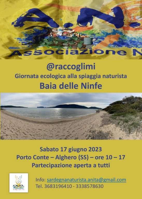 L’ANITA – Associazione Naturista Italiana con la sezione affiliata di Sardegna Naturista informa che realizzerà una Giornata ecologica presso la spiaggia naturista della “Baia delle Ninfe” (Porto Conte – Alghero) nella data di sabato 17 giugno 2023, a partire dalle ore 10:30.