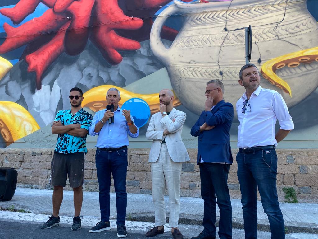 Inaugurati i primi due progetti grafici. Quella di Tellas è un’opera concettuale, con i suoi tratti distintivi e i colori tenui, che in qualche modo ricorda i fondali marini. L’opera di Luca Rancy vuole essere il simbolo della vita che nasce dentro il quartiere: un grande corallo rosso nascente, segno distintivo di Alghero, elementi marini che richiamano la natura di città che si affaccia sul mare e uno dei vasi preistorici ritrovati all’interno delle Domus de Janas di Cuguttu, esposto al Museo archeologico.