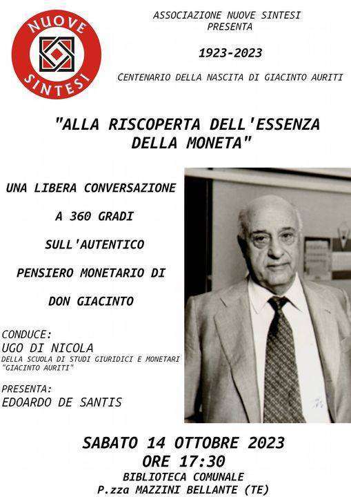 Sabato 14 ottobre, in occasione del centenario della nascita di Giacinto Auriti, l’ Associazione Culturale Nuove Sintesi organizza “Alla riscoperta dell’essenza della moneta”.   Interverrà Ugo Di Nicola (della Scuola  di studi giuridici  e monetari “Giacinto Auriti” )  con l’introduzione di Edoardo De Santis (Nuove Sintesi). L’incontro si terrà presso la Biblioteca Comunale in Piazza Mazzini, a Bellante, alle ore 17.30. Ingresso Libero.