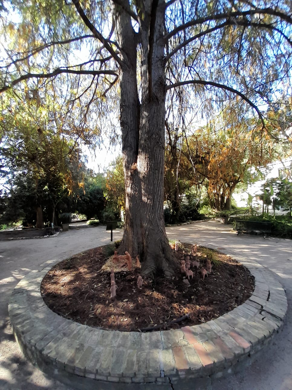 Le statue in terracotta della tradizione asseminese sono state sistemate all’ombra del Cipresso di palude (Taxodium distichum (L.) Rich.), un grande albero presente nell’Orto Botanico sin dalla fondazione. Si tratta di un meraviglioso esemplare che nel suo paese d’origine – il nord America – vegeta in zone paludose affondando le radici nel fango. Alla base del grande fusto la natività e i personaggi ben dialogano al riparo dei lunghi rami che portano foglie che nel periodo invernale cambiano colore, dal verde brillante al color ruggine, prima di cascare al suolo conferendo allo spazio circostante una suggestiva colorazione.