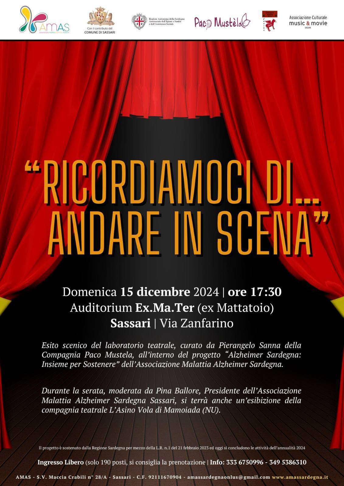 Domenica 15 dicembre alle 17.30 all’Auditorium Ex.Ma.Ter (ex mattatoio) di Via Zanfarino a Sassari, l’Associazione Malattia Alzheimer Sardegna – Sassari presenta “Ricordiamoci di… andare in scena!”, l’esito scenico del laboratorio teatrale curato da Pierangelo Sanna della Compagnia Paco Mustela, che fa parte del progetto “Alzheimer Sardegna: Insieme per Sostenere”.
