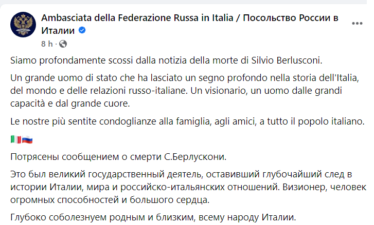Siamo profondamente scossi dalla notizia della morte di Silvio Berlusconi. Un grande uomo di stato che ha lasciato un segno profondo nella storia dell’Italia, del mondo e delle relazioni russo-italiane.