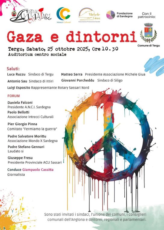 Per questo, il percorso prosegue sabato 25 ottobre 2025 alle ore 10.30, all’Auditorium del Centro Sociale di Tergu, con il forum “Gaza e dintorni”, promosso nell’ambito del Festival Ammajare Off e organizzato dall’Associazione Michele Giua, con la collaborazione di Intrecci Culturali e il patrocinio del Comune di Tergu.