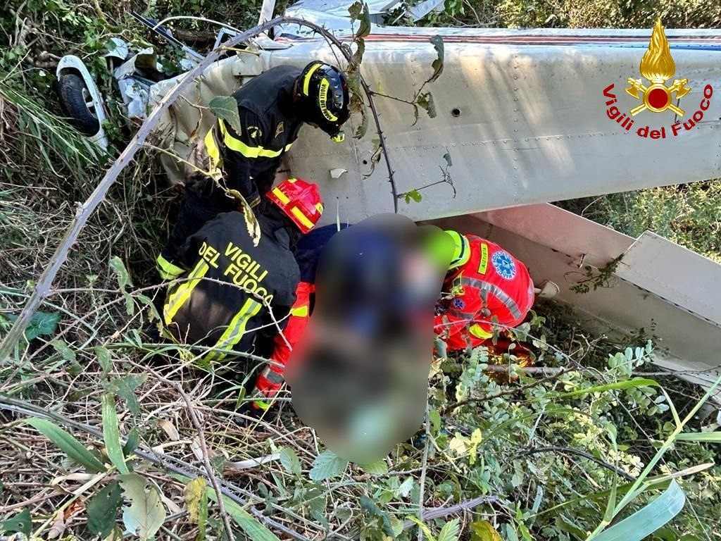 I vigili del fuoco sono intervenuti a Trecastelli, provincia di Ancona, per soccorrere due persone che viaggiavano a bordo di un aereo ultraleggero precipitato sul greto del fiume Cesano.