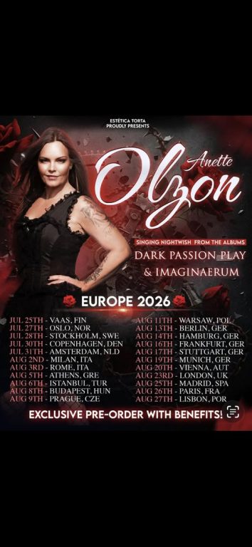 Più di dieci anni dopo, è finalmente arrivato il momento che gli appassionati europei di metal sinfonico attendevano. Anette Olzon è pronta a tornare sui palcoscenici europei, lanciando il suo primo tour attraverso il continente dal 2012. Questa serie speciale e rigorosamente limitata di concerti celebrerà gli amati album dei NIGHTWISH che ha contribuito a dare vita, Dark Passion Play (2007) e Imaginaerum (2011), con qualche sorpresa extra promessa lungo il percorso.