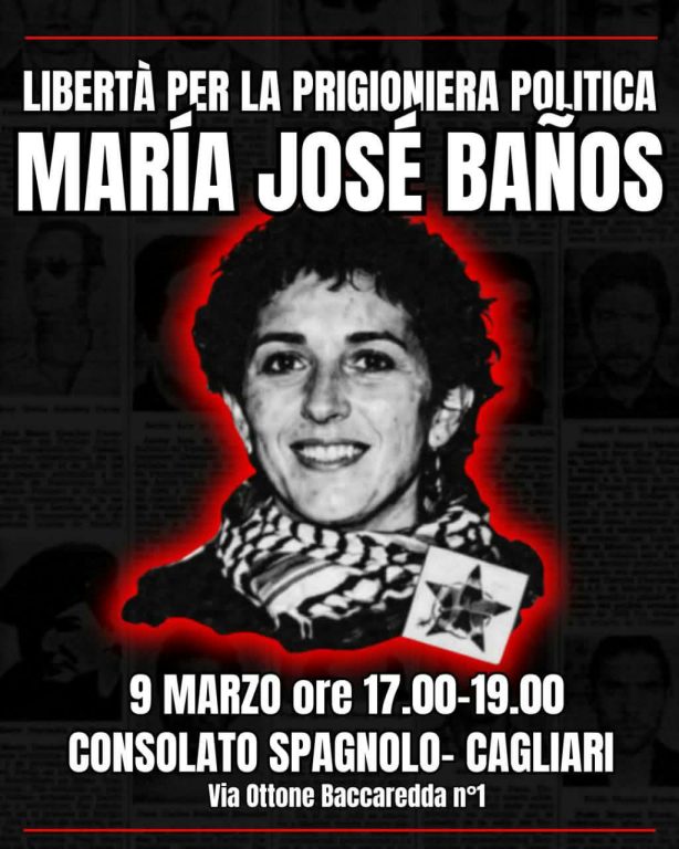 La richiesta immediata degli scioperanti e dei solidali che si stanno mobilitando nelle strade, è che María José venga trasferita in ospedale affinché possa ricevere le necessarie cure che le vengono sistematicamente negate in carcere, e che venga avviata la procedura per la sua scarcerazione per motivi di salute. Per questo come Coordinamento Antifascista Cagliaritano ci uniamo alla mobilitazione internazionale lanciando un presidio solidale per chiedere la sua immediata scarcerazione”, affermano i promotori della mobilitazione.