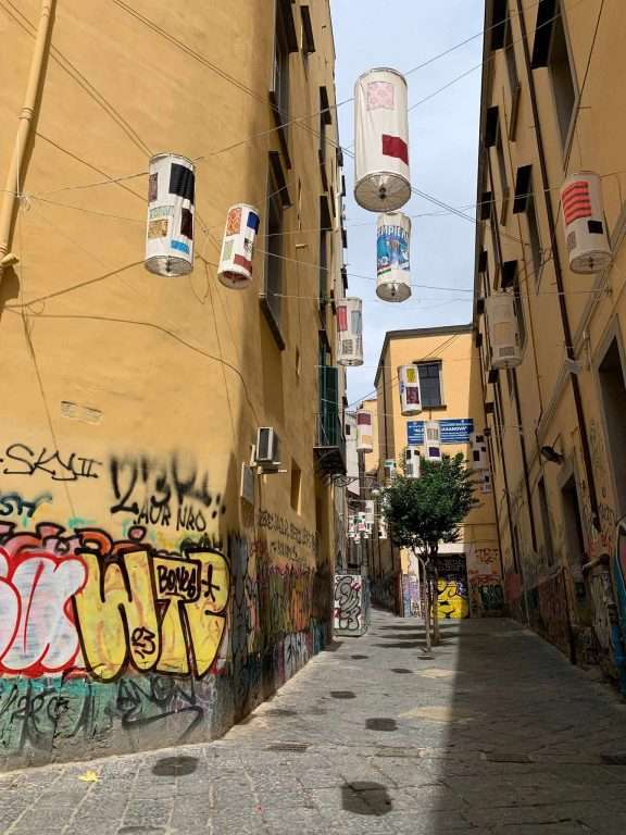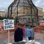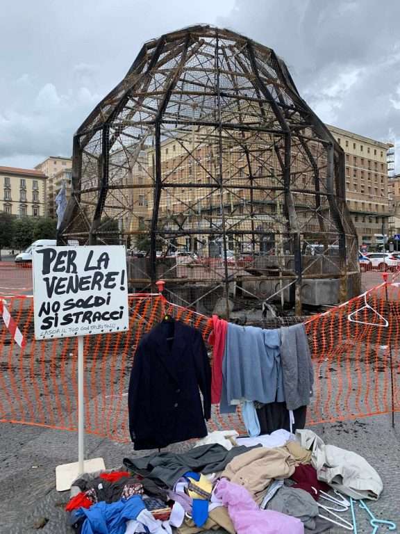 L’intervento d’Antonio Marras consiste in una serie di lampadari Indy, stracci riutilizzati e ricuciti che omaggiano anche il terzo scudetto del Napoli, il tutto realizzato con la collaborazione degli studenti dell’Accademia di Napoli (a Cagliari l’Alta Formazione Artistica non è ancora pervenuta). L’intervento si situa in un’arteria del centro storico di Napoli, ridotta a orinatoio pubblico da tempo, dove qualche tempo fa vidi rubare un cellulare, vicolo ideale per gettare schede sim mai più localizzate, ma con la luce dei lampadari di Marras, si spera il vicolo viva di nuova luce, per inciso Marras a Napoli è considerato uno stilista qualunque, ma attraverso l’Alta Formazione Artistica autoctona, è stato posto in condizione d’interfacciarsi su temi e contenuti culturali locali (“Questi fantasmi”), ragionando come Pistoletto, a partire dal riciclo di stracci, in quest’ottica un anonimo artista Napoletano, invita a rifornire nuovamente di stracci la Venere di Pistoletto, il che porta a chiedermi: quanto tempo ci vorrà perché gli abiti di Marras diventeranno stracci per una riproduzione di una Venere di Pistoletto? Si dice a Napoli, uno stilista è famoso, quando trovi una riproduzione del suo stile al mercato, insomma quando genera stracci, non quando li ricicla, a Napoli, gli stracci dell’arte contemporanea invece paiono non smettere di volare, sarà per quello che generano economicamente, l’Alta Formazione Artistica nei secoli, trasforma gli stracci in oro, Marras l’ha capito, Cagliari non ancora.