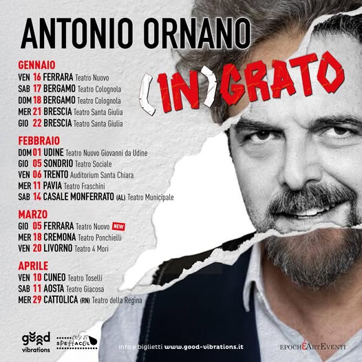 Dopo il successo dello spettacolo “Maschio caucasico irrisolto” che per 2 anni ha girato i teatri italiani… arriva un nuovissimo show di Antonio Ornano che debutterà nel 2026: “(In)grato”.