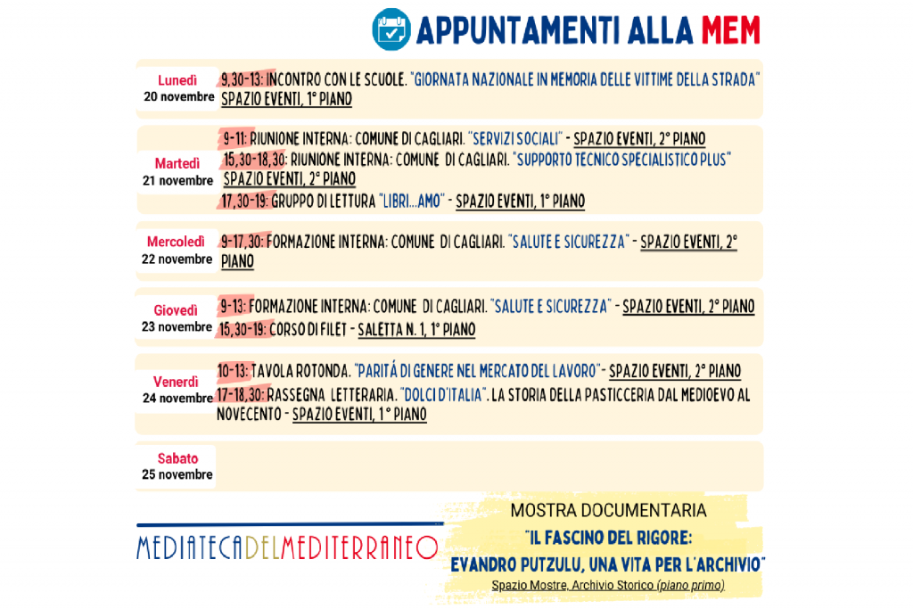 Ecco il programma settimanale, dal 20 al 26 novembre 2023, delle iniziative culturali della MEM – Mediateca del Mediterraneo al civico 164 di via Mameli a Cagliari.