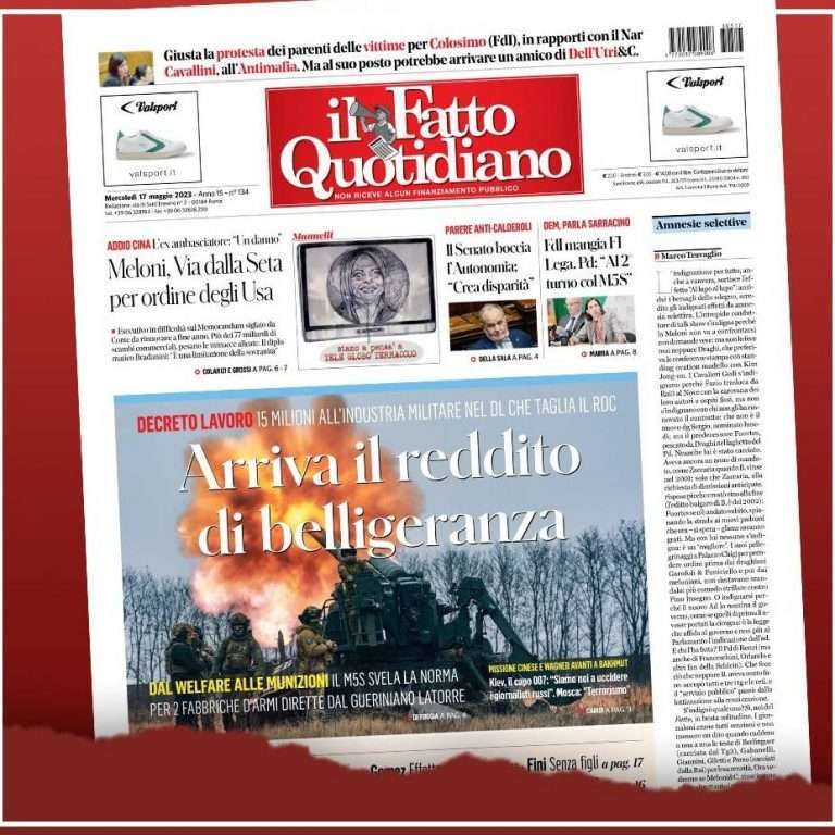 “Arriva il reddito di belligeranza”, è questo il titolo del quotidiano Il Fatto che ricorda come il Governo Meloni stia raccontando balle in merito ai finanziamenti per il conflitto in Ucraina.
