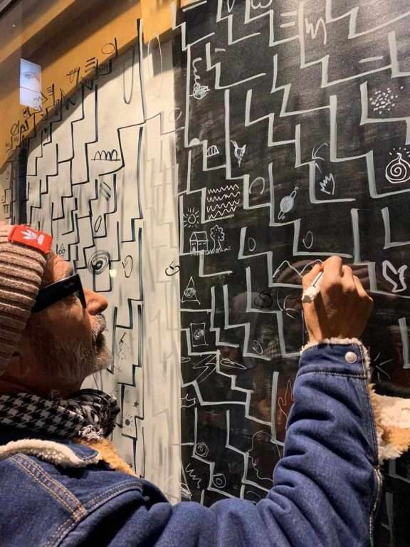 Invitando ogni partecipante (compresi vecchi matusa di mezzo secolo e più d’età, come me, Massimo Campagna, Alfonso Caccavale e Claudia Del Giudice) a disegnare i tratti all’interno del mosaico di spazi e percorsi mappati da lui, conferendo alla dinamica del fare arte una rappresentazione condivisa e interattiva.