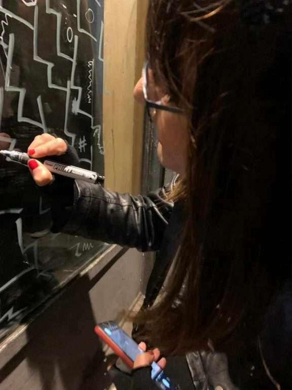 La performance è stata ritmica ed estremamente elegante, armonica nella partitura d’insieme e nell’interazione degli astanti che si passavano i pennarelli per operare sulla vetrina.