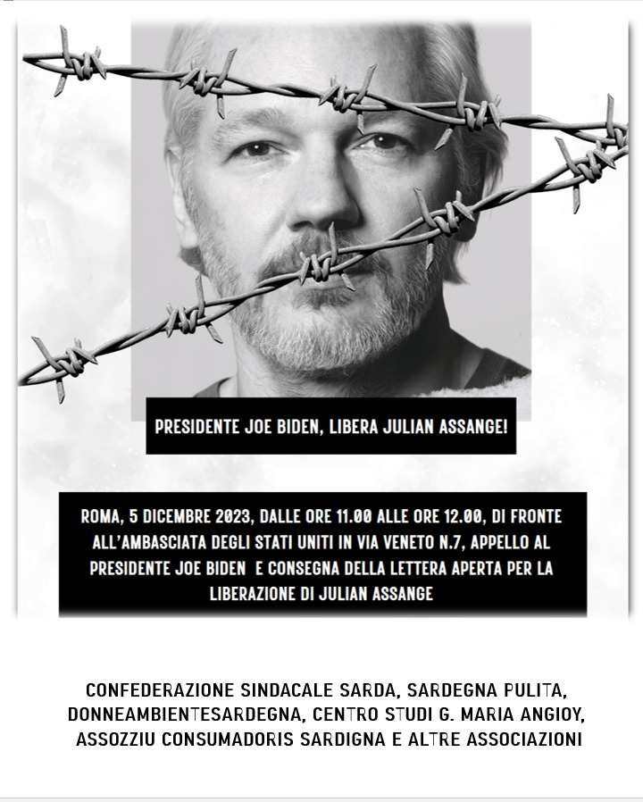 Nella mattina di martedì 5 dicembre, una delegazione della Confederazione Sindacale Sarda, di Sardegna Pulita, di DonneAmbienteSardegna, del Centro Studi G.Maria Angioy, di Assozziu Consumadoris Sardigna e di altre associazioni, sarà a Roma, davanti l’Ambasciata Americana ( via Veneto ) per lanciare un appello per la liberazione di Julian Assange.