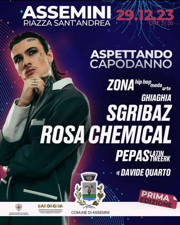 Ad annunciarlo è il Sindaco Mario Puddu che sui social ha scritto: “Il 29 dicembre, grande appuntamento in piazza Sant’Andrea, ‘Aspettando il Capodanno’ con l’esibizione di Rosa Chemical e tanti altri artisti, per vivere un momento di svago nella nostra cittadina”.