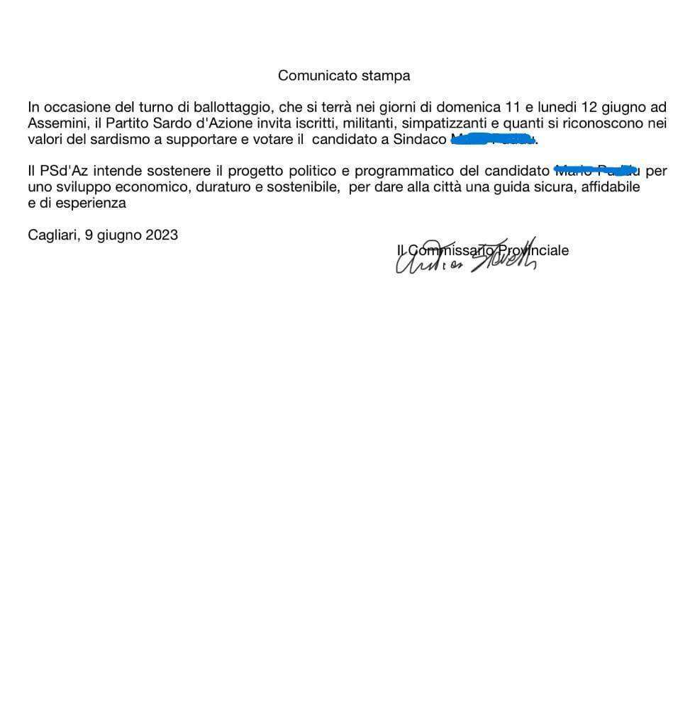 Infatti, venerdì 9 giugno, quando ancora era possibile fare campagna elettorale, il Commissario del partito di Solinas ha inviato una nota che oggi, è stata pubblicata in una testata cartacea.