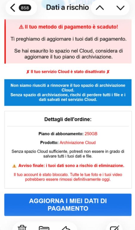 Ora i criminali utilizzano falsi messaggi che fingono di provenire dal servizio iCloud, sostenendo che lo spazio di archiviazione sia scaduto e che sia urgentissimo aggiornare i dati di pagamento, altrimenti foto e file verranno eliminati.