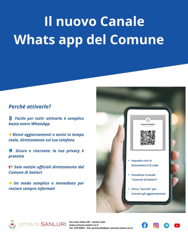 Il Comune amplia i propri strumenti di comunicazione istituzionale aprendo il nuovo canale informativo su WhatsApp denominato “Comune di Sanluri”.