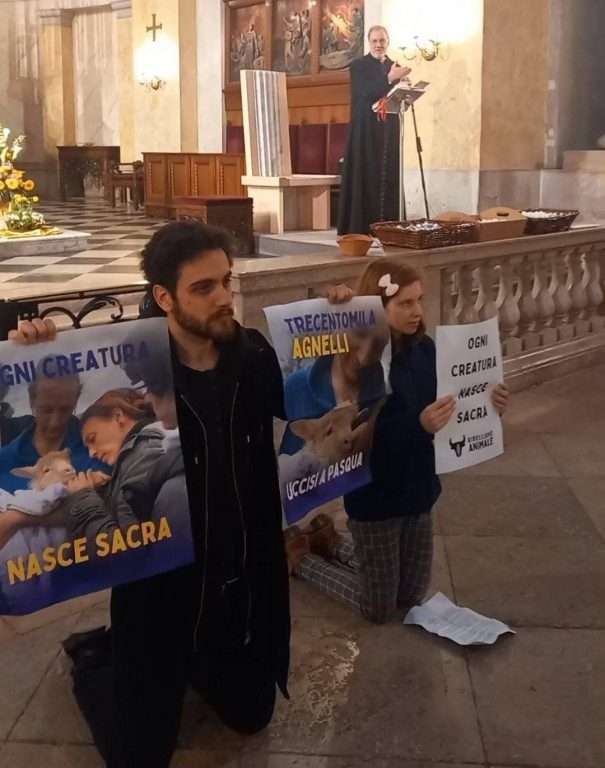 Nelle città di Trieste, Milano e Palermo, le attiviste antispeciste prendono parola per portare un messaggio di amore e Liberazione, denunciando la sofferenza e le 376.000 morti di agnelli che avvengono in Italia solamente nel periodo di Pasqua all’unico scopo di riempire i piatti. Le persone hanno preso parola nelle chiese prima dell’inizio delle funzioni liturgiche, hanno esposto cartelli ed immagini dentro e fuori dai luoghi di culto, portando il loro messaggio di Liberazione e convivenza pacifica con tutte le specie.