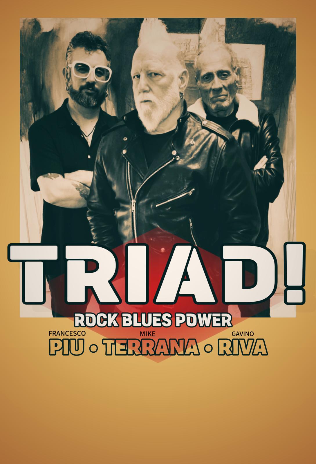Triad! nasce dall’incontro tra il batterista americano Mike Terrana, il chitarrista osilese Francesco Piu e il bassista sassarese Gavino Riva. Il primo è batterista di fama mondiale conosciuto per le sue collaborazioni nell’ambito rock e metal, il secondo è bluesman che ha condiviso il palco con giganti quali Tommy Emmanuel, Jack Johnson ed Eric Bibb, li terzo è bassista storico del panorama isolano che ha spaziato dal jazz all’etnico (collaborazioni da Billy Cobham a Piero Marras): un vero crossroad, crocevia in cui queste tre anime si incontrano fra rock e rispettivi bagagli sonori. Un’onda incontrollabile di Rock & Blues, trascinante.