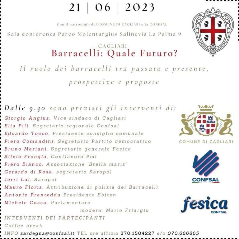 L’incontro organizzato dalla segreteria regionale Confsal Sardegna, patrocinato dal Comune di Cagliari vedrà la partecipazione di Giorgio Angius, Vicesindaco di Cagliari, del prof. Elia Pili, Segretario Regionale della Confsal, dell’on. Edoardo Tocco, Presidente del Consiglio Comunale di Cagliari, dell’On. Piero Comandini, Segretario Regionale del Partito Democratico, dell’On. Michele Cossa, Presidente della Commissione Regionale speciale per il riconoscimento del principio di insularità, di Bruno Mariani, Segretario Generale Fesica – Confsal, di Silvio Frongia, Presidente Conflavoro PMI Sardegna, di Antonello Pranteddu, Presidente Ebiten Sardegna, di dirigenti ed esperti legati al mondo dei barracelli come da locandina allegata. Modererà l’incontro Mario Friargiu, tesoriere Confsal Sardegna.