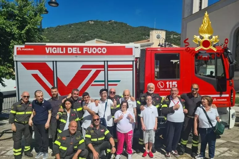 I ragazzi con disabilità dell’associazione onlus Orchestra Spensierata di Berchidda e i volontari che vi operano, hanno incontrato i vigili del fuoco del comando di Sassari, che per l’occasione hanno fatta tappa nella piazza principale della cittadina.