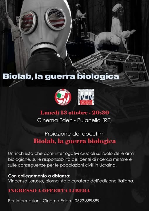Lunedì 13 ottobre a Puianello in provincia di Reggio Emilia ci sarà la proiezione del Documentario di Russia Today, “Biolab, la guerra biologica”.