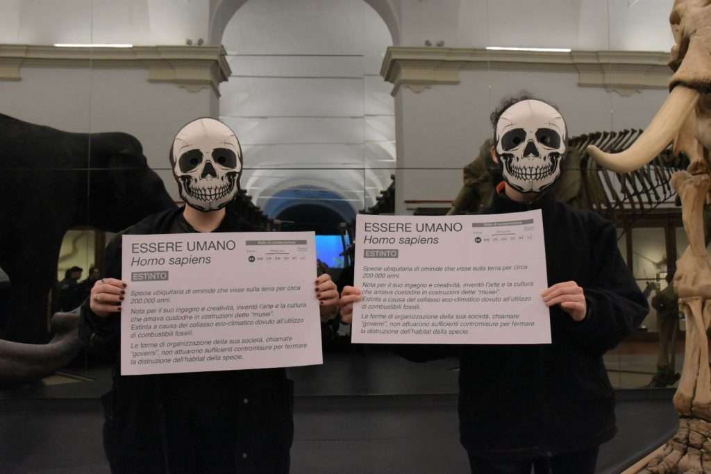 Due di loro reggevano lo striscione con scritto “Crisi eco-climatica: diamoci una mossa prima che di noi rimangano solo ossa”. Ai loro piedi alcuni cartelli che, ispirandosi a quelli che accompagnano i corpi imbalsamati di centinaia di animali contenuti nella stessa sala, riportavano la didascalia: “Homo sapiens: estinto. Specie ubiquitaria di ominide che visse sulla Terra per circa 200.000 anni. Nota per il suo ingegno e creatività, inventò l’arte e la cultura che amava custodire in costruzioni dette musei. Estinta a causa del collasso eco-climatico dovuto all’utilizzo di combustibili fossili. Le forme di organizzazione della sua società, chiamate governi, non attuarono sufficienti contromisure per fermare la distruzione dell’habitat della specie”. “In questo momento storico – hanno spiegato le attiviste – quando il futuro della Terra è così legato alle decisioni politiche dei nostri governi, non si può parlare di scienza senza fare politica. Il Museo, come istituzione scientifica e di ricerca, dovrebbe ricordare ai governi l’urgenza di prendere decisioni per garantire la vita sulla Terra”.