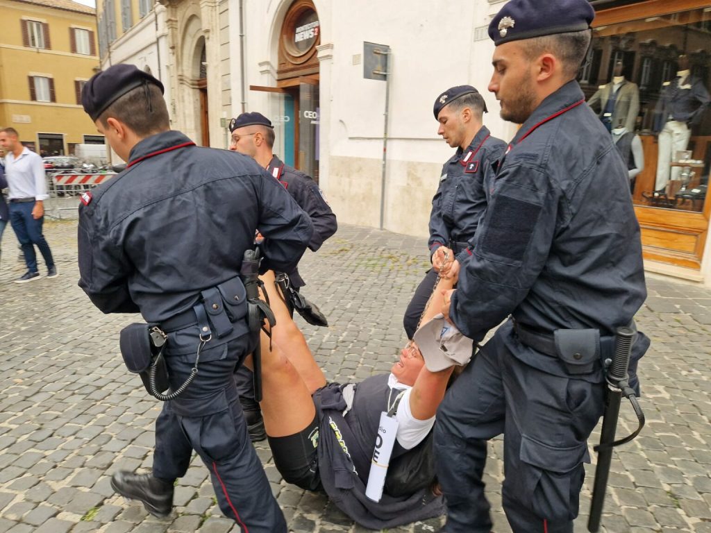 Blitz di Ultima generazione alla Camera. Un gruppo di attivisti ha cercato poco fa di avvicinarsi all’ingresso principale di Montecitorio ed è stato respinto dalla forze dell’ordine. “Volevamo attaccarci in piazza e mostrare la bandiera della Palestina”, spiega un ragazzo.