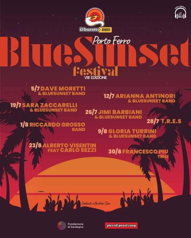 L’estate abbraccia la baia di Porto Ferro, recentemente salita alla ribalta – e non è più una novità – per lo sventolare orgoglioso di una bandiera blu e per la visita delle telecamere della popolare trasmissione televisiva Linea Blu. Un luogo magico e incantato, che sa però esprimere al meglio il decalogo dell’accoglienza isolana e apre le sue porte alla passione e alla Cultura, elementi “di casa” sul palco del Baretto. Passione per la musica e per il tramonto – uno dei più belli dell’intera Sardegna – coniugati all’ennesima potenza nell’ottava edizione del BlueSunset festival (sostenuto dalla Fondazione di Sardegna e lavorato dalla Cooperativa Piccoli Passi e dallo staff del Baretto), manifestazione che ha nel blues il suo splendido essere, incorniciato da un paesaggio che fa la differenza e crea l’ambiente giusto per l’ascolto. Così è, da otto anni a questa parte. Così sarà, ancora, per l’intera estate.